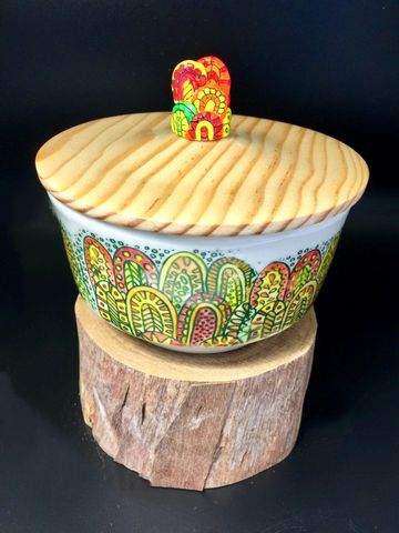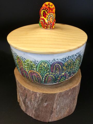 Porcelain jar with wood lid and cactus knob Heigth 2.5 in Width 4 in