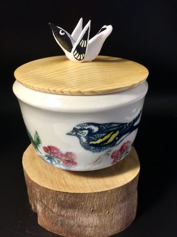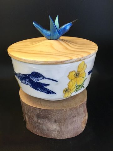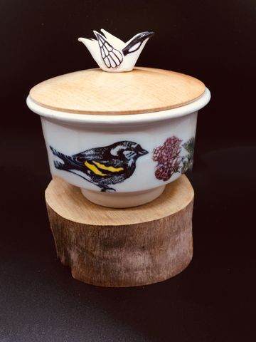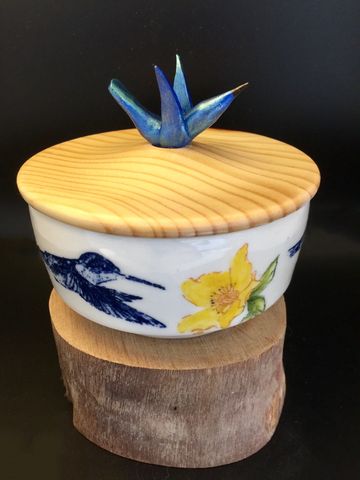 Porcelain jar with wood lid and hummingbird bird knob Heigth 2.75 in Width 4.5in