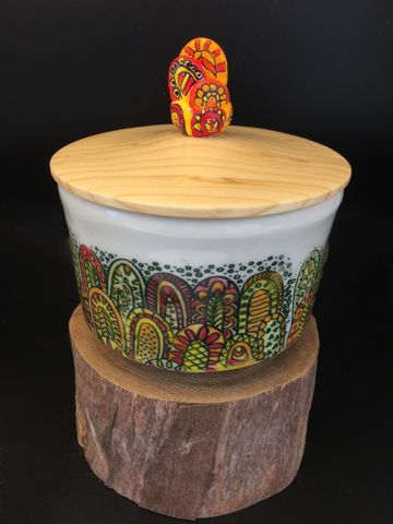 Porcelain jar with wood lid and bird knob Heigth 3 in Width 4.25in