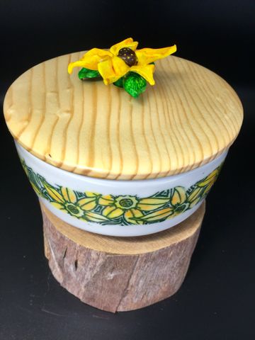 Porcelain jar with wood lid and flower knob Heigth 2.25 in Width 4.5in